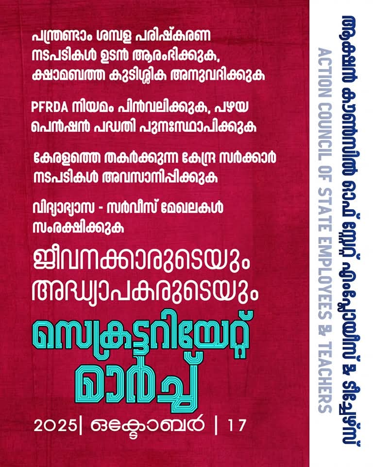 തിരുവനന്തപുരം:സിവിൽ സർവീസിൻ്റെ സംരക്ഷണത്തിനും ജീവനക്കാരുടെയും അധ്യാപകരുടെയും അവകാശ ആനുകൂല്യങ്ങൾ ഉറപ്പുവരുത്തുന്നതിനും സംസ്ഥാന ജീവനക്കാരും അധ്യാപകരും ആക്ഷൻ കൗൺസിൽ ഓഫ് സ്റ്റേറ്റ് എംപ്ലോയീസ് & ടീച്ചേഴ്സിൻ്റെ നേതൃത്വത്തിൽ 2025 ഒക്ടോബർ 17ന് സെക്രട്ടറിയേറ്റ് മാർച്ചും ധർണ്ണയും സംഘടിപ്പിക്കുകയാണ്.